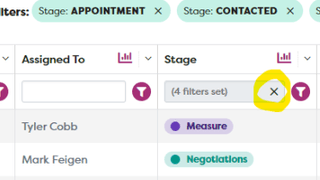 Currently, users who apply multiple filters for a specific column (i.e. Stage or Assigned User) have to deselect them one at a time. The system then loads between each deselection, causing a delay. Now, you can clear all filters for a specific column in one click!