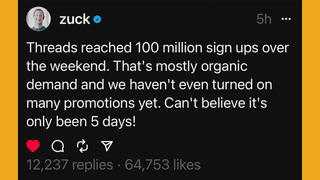 Are y'all ready for this? Introducing Threads, by Meta (parent company of Facebook and Instagram), is ready to take Twitter head-on. Threads has exploded with a jaw-dropping 100 million downloads and user sign-ups in less than one week of launching. For reference, Twitter has an estimated total user base of 350 million as of 2023.